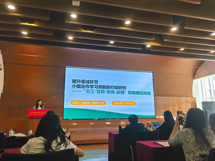 6-7日的“AI在POA教学与研究中的应用研修班”同样干货满满。文秋芳教授以“AI时代的外语教育:四要素新课程模式解析”为题,指出 AI 可作“连接器与增强器”,通过多条途径强化教师、学生、教材之间的互动;中国政法大学张文娟副教授以“AI赋能POA教材使用”为题,提出了“可迁移性”和“可理解性”两条教材评估标准,作为教材“选、改、增”的依据;首都师范大学邱琳副教授以“AI赋能POA教学:驱动—促成—评价”为题,通过实际教学案例展示AI赋能的优势。北京科技大学孙曙光副教授以“AI赋能口译师生合作评价(TSCA)——以视译为例”为题,分析了TSCA在教学过程中面临的挑战,并演示TSCA如何升级为TAISCA。接着,参班教师分组研讨实践,经汇报与点评提升了实操能力与数字素养。