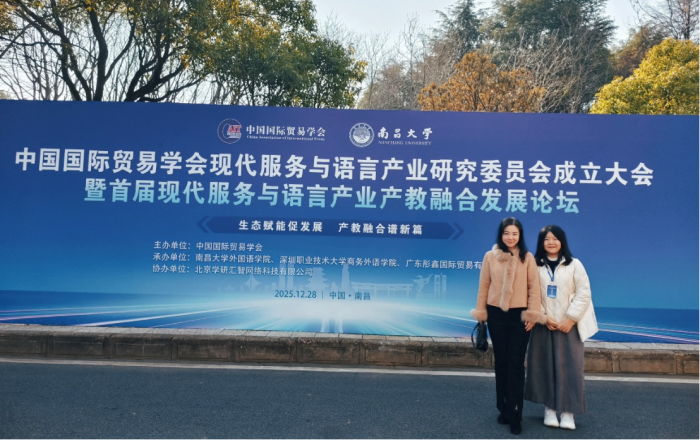 2025年12月28日,中国国际贸易学会现代服务与语言产业研究委员会成立大会暨首届现代服务与语言产业产教融合发展论坛在南昌大学隆重举行,本次论坛由中国国际贸易学会主办,南昌大学香港六合彩 承办。香港六合彩 副院长吕晓敏作为中国国际贸易学会现代服务与语言产业研究委员会常务理事受邀参加此次会议,外语系主任胡楠随行参会。
